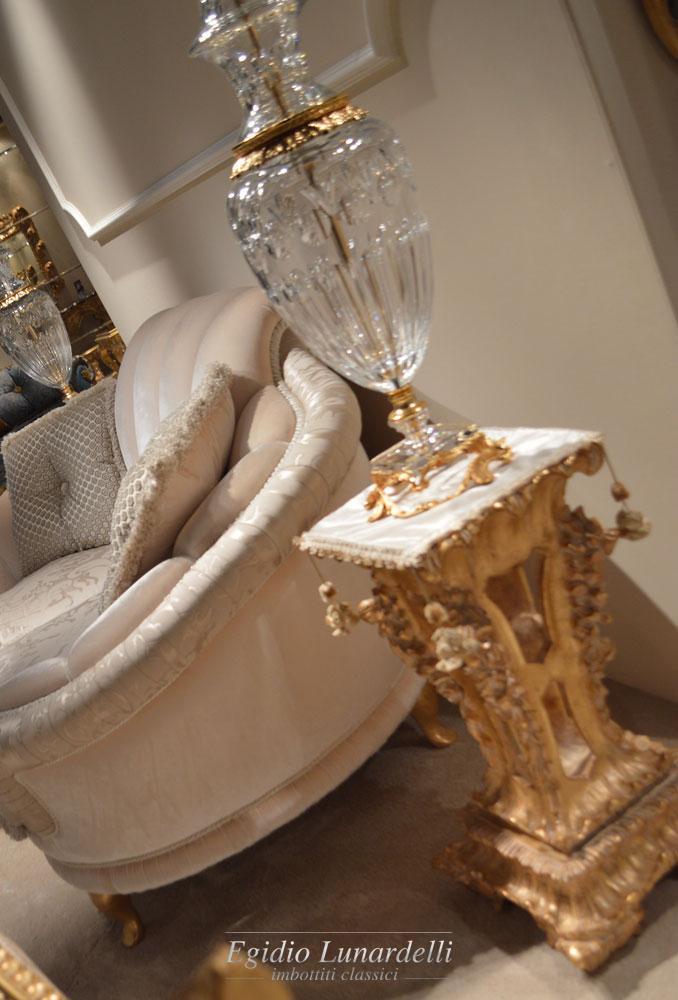 Tessuti italiani, legno massello intagliato a mano, finiture in oro foglia, passamaneria fioccata a mano e soprattutto, una elevata specializzazione, sono gli strumenti con i quali ogni giorno esprimiamo la nostra creatività.